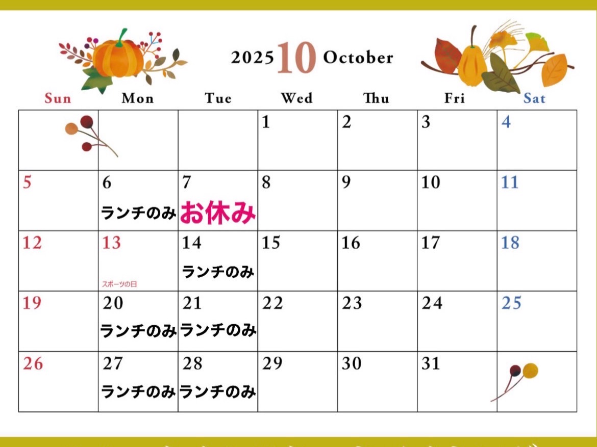 10/ 6(月)、14(火)、20(月)、21(火)、27(月)、28(火)