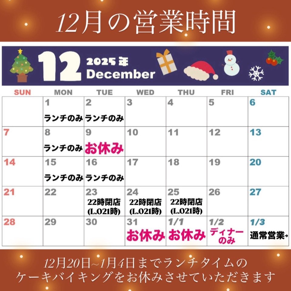 2025年12月・年末年始の営業時間をお知らせいたします。